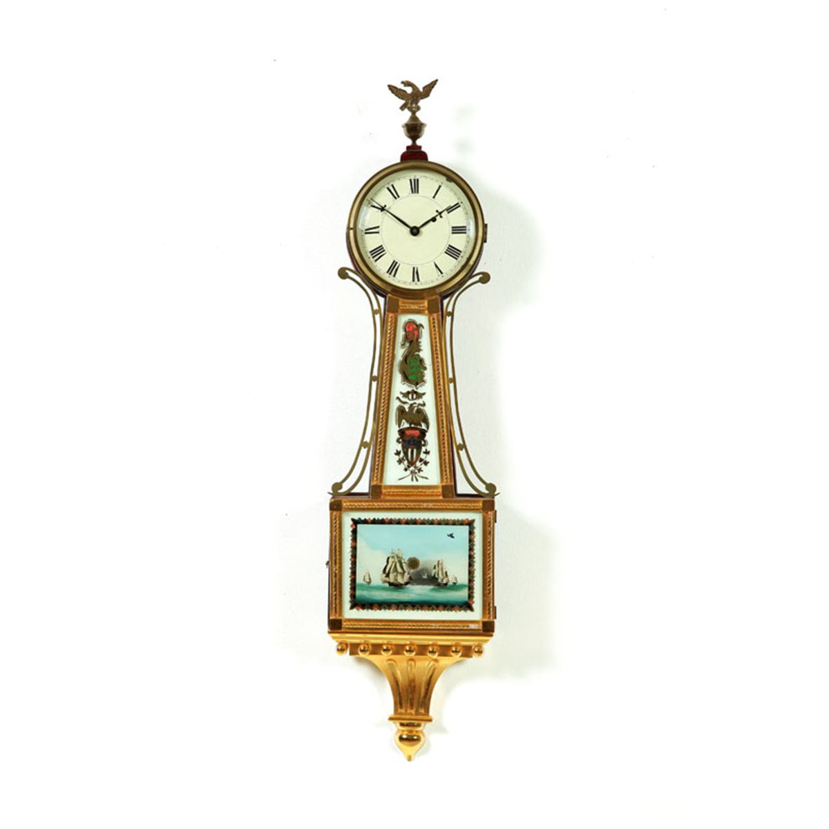 American, 2nd quarter-19th century, mahogany and gilt. Painted dial, brass eagle finial, and reverse glass painted panels of eagle and sea battle. Imperfections. 42"h. Ex Don and Jill DeSapri (Ohio).