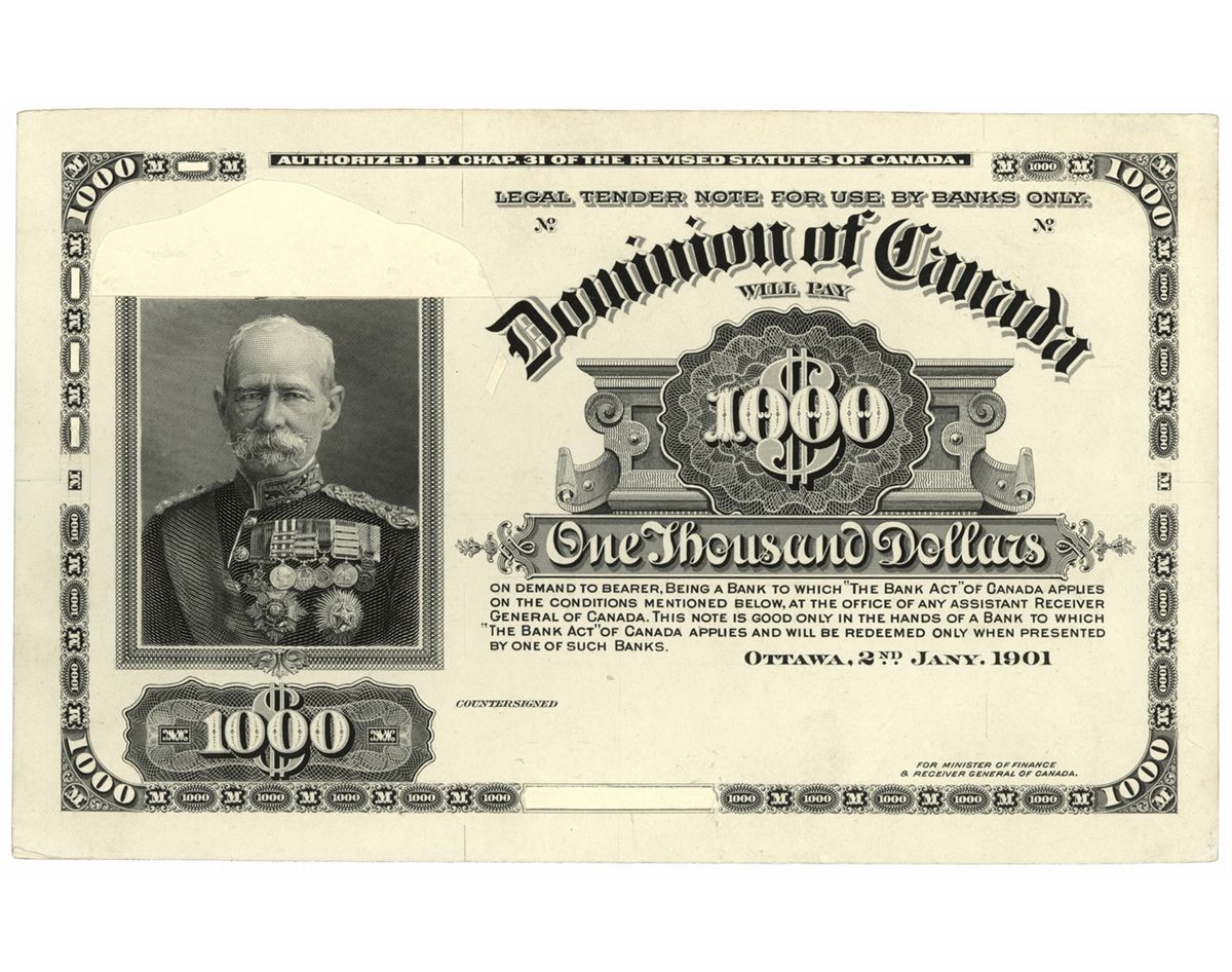 BANK LEGAL. $1000.00 Jan. 2, 1901. DC-33P. A Face and Back Proof. The face Proof without tint, on card with some elements cut out. A Back Proof in green on thin paper. A vignette of Lord Roberts-(Canada A-8), on a large card. Lot of three (3) proofs.
