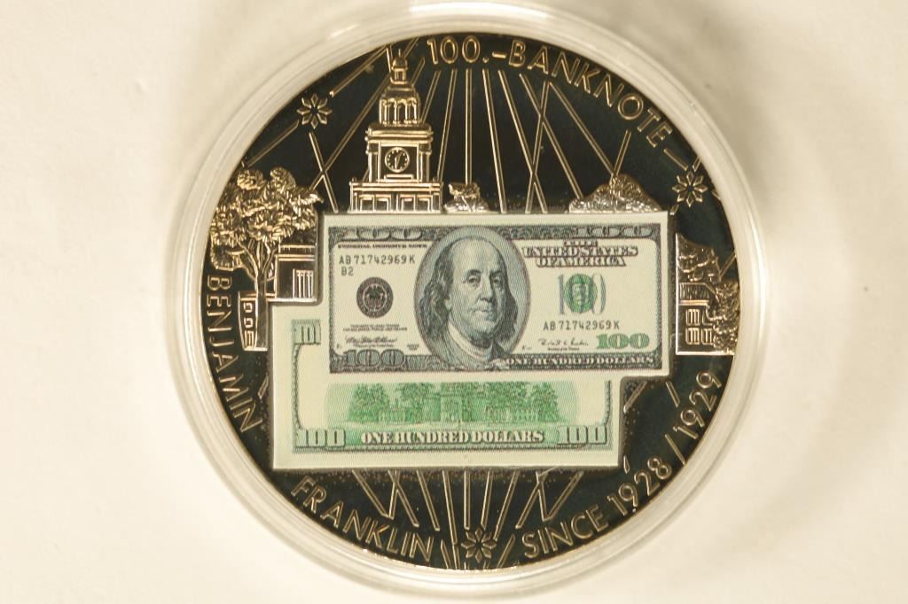 BENJAMIN FRANKLIN $100 BRILLIANT UNC IN HARD PLASTIC CAPSULE. 32 GRAMS 40MM. LIMITED EDITION WITH CERT. BY THE AMERICAN MINT