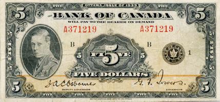 BANK OF CANADA. $1.00. 1935 Issue. BC-1. English Text. No. A0791258. VG; $1.00. 1935 Issue. BC-2. French Text. No. F2913027/C. VG; $2.00. 1935 Issue. BC-3. English Text. No. A509331/D. About Good; $5.00. 1935 Issue. BC-5. English Text. No. A371219/B. VG; $10.00. 1935 Issue. BC-7. English Text. No. A337979/A. VG. Lot of five (5) notes.
