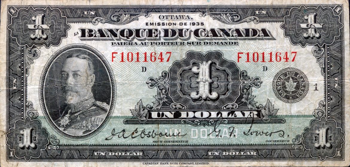 BANK OF CANADA. $1.00. 1935 Issue. English Text. BC-1. No. A8995076/A. BCS graded Very Fine-25.