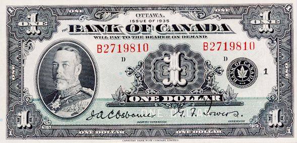 BANK OF CANADA. $1.00. 1935 Issue. English Text. BC-1. No. B2719810/D. BCS graded Very Fine-25.