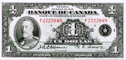 BANK OF CANADA. $1.00. 1935 Issue. French Text. Osborne. BC-2. No. F2727049. CCCS graded AU-55.