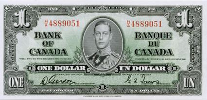 BANK OF CANADA. $1.00. 1937 Issue. BC-21b. Gordon-Towers. Narrow Panel. No. H/A4889051. Choice Unc-63. Ex. Torex. June 15-16, 2001. Lot #214.