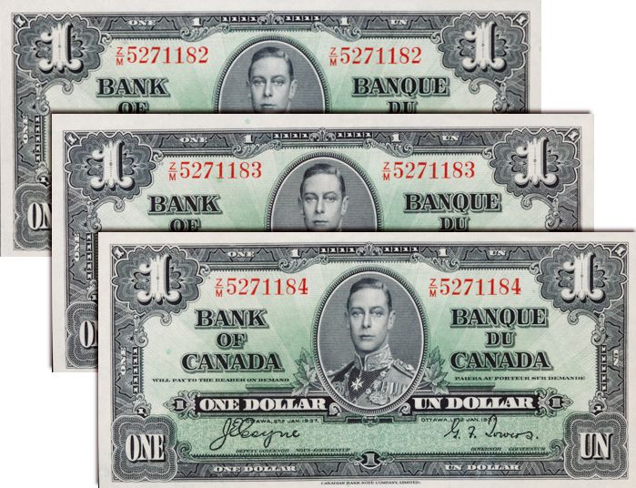 BANK OF CANADA. $1.00. 1937 Issue. BC-21d. Coyne-Towers. No. Z/M5271182. PCGS graded UNC-65. Z/M5271183, Z/M5271184. Both PCGS Unc-64. Lot of three (3) consecutive notes.
