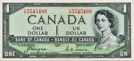 BANK OF CANADA. $1.00. 1954 Issue. BC-29a. ‘Devil’s Face’. Coyne-Towers. No. D/A5545488. PMG graded AU-58.