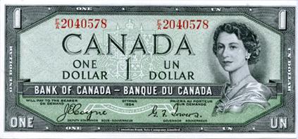 BANK OF CANADA. $1.00. 1954 Issue. BC-29a. ‘Devil’s Face’. Coyne-Towers. No. E/A2040578. PMG graded AU-55. EPQ.