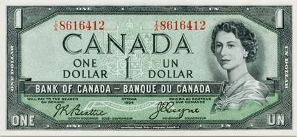 BANK OF CANADA $1.00. 1954 Issue. BC-29b. ‘Devil’s Face’. Beattie-Towers. No. I/A861412. BCS graded Unc-60. ‘Original’.