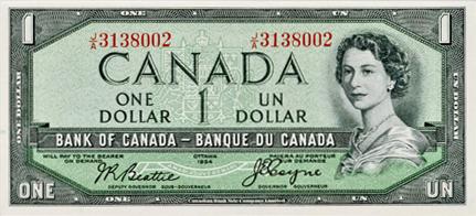 BANK OF CANADA. $1.00. 1954 Issue. BC-29b. ‘Devil’s Face’. Beattie-Towers. No. J/A3138002. PMG graded Choice Unc-64.