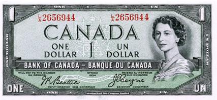 BANK OF CANADA. $1.00. 1954 Issue. BC-29b. ‘Devil’s Face’. Beattie-Towers. No. L/A2656944. PMG graded Choice Unc-64.