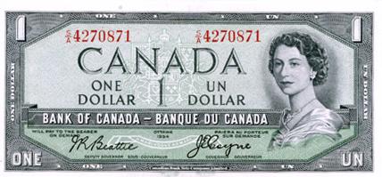 BANK OF CANADA. $1.00. 1954 Issue. BC-29b. ‘Devil’s Face’. Beattie-Towers. No. S/A4270871. PMG graded Gem Unc-65. EPQ.