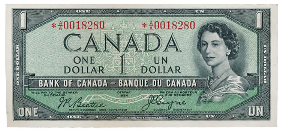 BANK OF CANADA. $1.00. 1954 Issue. BC-29bA. No. *A/A0018280. Beattie-Coyne. Devil’s Face’. Unlisted in the C.P.M.S. Registry. A bright uncirculated.