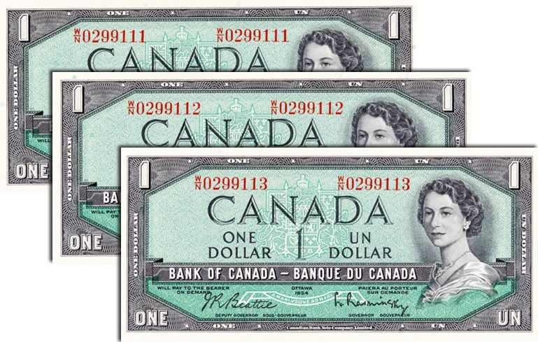 BANK OF CANADA. $1.00. 1954 Issue. BC-37b. Beattie-Rasminsky. No. W/N0299111, 9112, 9113. Lot of thr