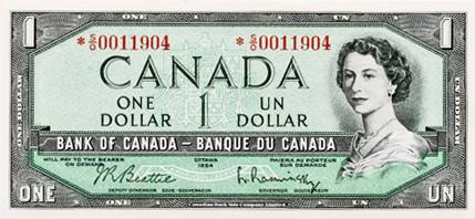 BANK OF CANADA. $1.00. 1954 Issue. BC-37bA. Beattie-Rasminsky. No. *S/O0011904. BC-37bA-i. No. *A/Y0096472. Both CCCS graded UNC-60.