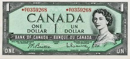 BANK OF CANADA. $1.00. 1954 Issue. BC-37bA-i. Beattie-Rasminsky. No. *H/Y0359268. CCCS graded Choice UNC-63.