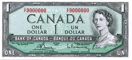 BANK OF CANADA. $1.00. 1954 Issue. BC-37c. ‘Modified’. Bouey-Rasminsky. No. 9000000. A Million numbered note. Unc.