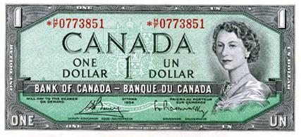BANK OF CANADA. $1.00. 1954 Issue. BC-37cA. Modified. No. *H/F0773851. CCCS graded Extra Fine-40.