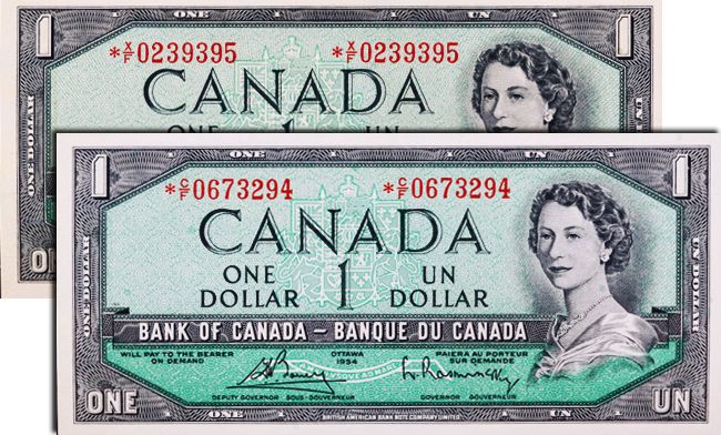 BANK OF CANADA. $1.00. 1954 Issue. BC-37dA. No. *X/F0239394 & 9395. Both PCGS graded PCGS Choice Unc- 64. PPQ. Two consecutive notes.