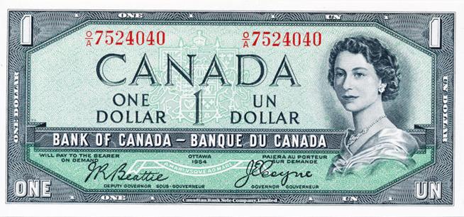 BANK OF CANADA. $1.00. 1954 Issue. 'Devil's Face'. BC-29b. No. O/A7524040. PCGS graded Unc-65. PPQ.