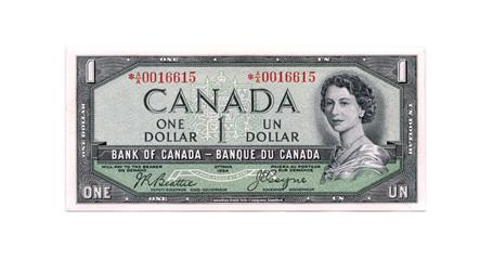 BANK OF CANADA. $1.00. 1954 Issue. 'Devil's Face'. BC-29bA. Beattie-Coyne. No. *A/A0016615. Choice Unc. A very scarce replacement note.