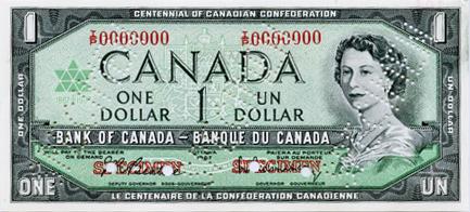 BANK OF CANADA. $1.00. 1967 Issue. BC-45aS. 18671967. SPECIMEN. Set No. 104. AU. From Moore’s 1999 Bank of Canada auction.