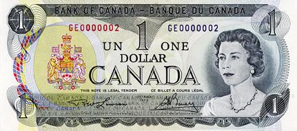 BANK OF CANADA. $1.00. 1973 Issue. BC-46a. Lawson-Bouey. No. GE0000002 through GE0000010. Lot of nine (9) consecutive low serial numbered notes. The first grades AU the others grade Unc to Choice Unc.
