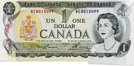 BANK OF CANADA. $1.00. 1973 Issue. BC-46a. Lawson-Bouey. No. NE8015499. A Folding error on the lower right corner, resulting in a small 1/8: piece attached at lower right. EF.