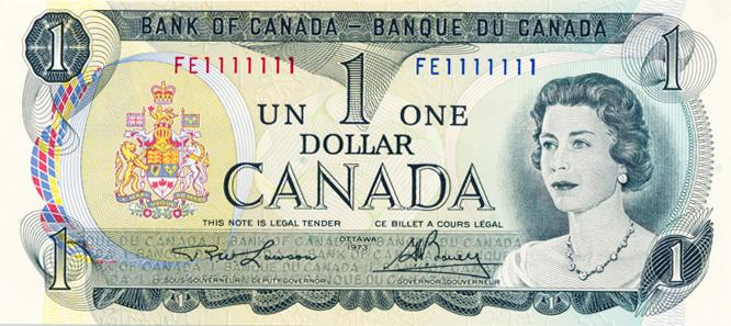 BANK OF CANADA. $1.00. 1973 Issue. BC-46a. No. FE1111111. A Solid Radar. PCGS graded Choice AU-58 PPQ.
