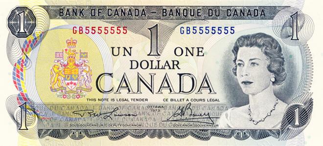 BANK OF CANADA. $1.00. 1973 Issue. BC-46a. No. GB5555555. A solid Radar note. PCGS graded Choice Unc-64. PPQ.