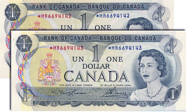 BANK OF CANADA. $1.00. 1973 Issue. BC-46aA. Lawson-Bouey. No. *MR6694142. No. *MR6694143. Lot of two (2) consecutive notes, both CCCS graded Gem Unc-65.