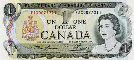 BANK OF CANADA. $1.00. 1973 Issue. BC-46aA-i. No. EAX0077211. Steel. Choice Unc.