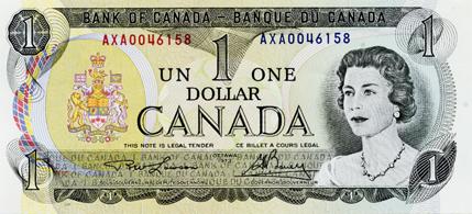 BANK OF CANADA. $1.00. 1973 Issue. BC-46aT-i. No. AXA0046158. Steel. Choice Unc.