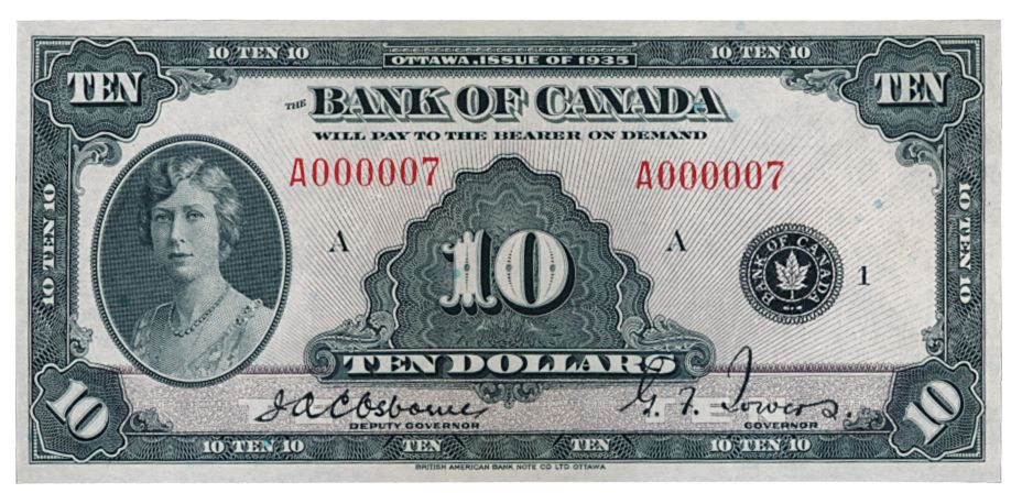 BANK OF CANADA. $10.00. 1935 Issue. English Text. BC-7. No. A000007/A. Listed in the C.P.M.S. Registry. From the Sept., 1970 Ingersoll sale. Hints of a counting crease at upper right corner. Another scarce, low serial numbered note. Choice AU.