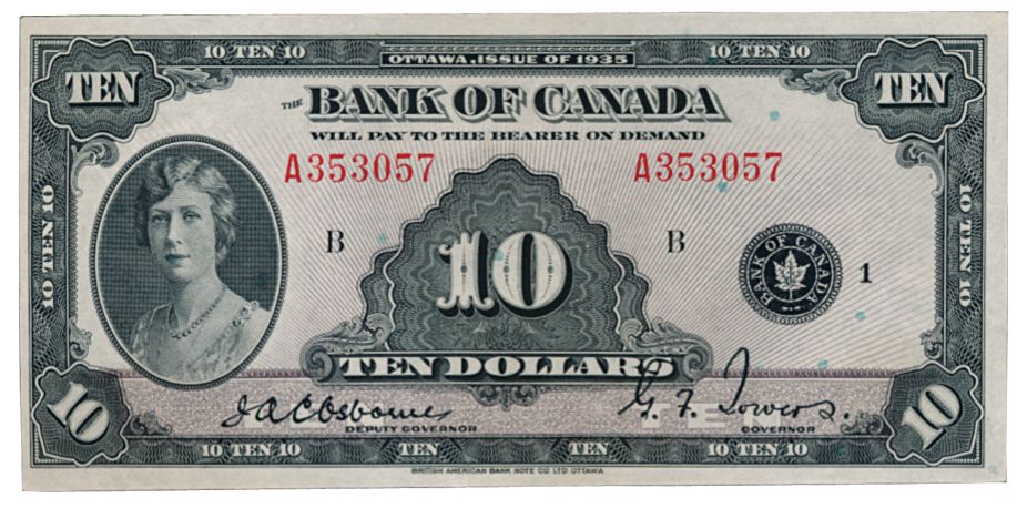 BANK OF CANADA. $10.00. 1935 Issue. English Text. BC-7. No. A353057/B. Hint of a minor center crease. AU.