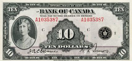 BANK OF CANADA. $10.00. 1935 Issue. English Text. Osborne. BC-7. No. A1035387/C. Unc.