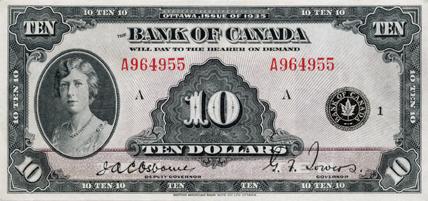 BANK OF CANADA. $10.00. 1935 Issue. English Text. Osborne. BC-7. No. A964955. BCS graded Extra Fine-40.