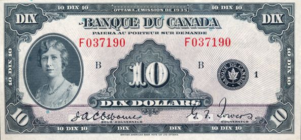 BANK OF CANADA. $10.00. 1935 Issue. French Text. BC-8. No. F037190/B. Minor center fold. Bright Extra Fine.