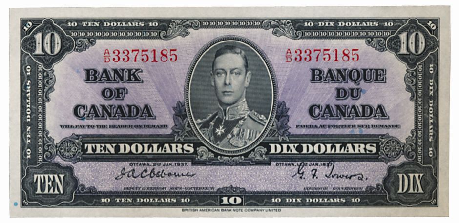 BANK OF CANADA. $10.00. 1937 Issue. BC-24a. No. A/D3375185. Osborne-Towers. A well centered Unc.