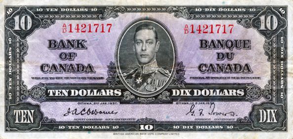 BANK OF CANADA. $10.00. 1937 Issue. BC-24a. Osborne- Towers. No. A/D1421717. PCGS graded Very Fine-20. PPQ.