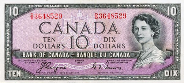 BANK OF CANADA. $10.00. 1954 Issue. BC-32a. Coyne-Towers. ‘Devil’s Face’. No. D/D3648529. PCGS graded Extra Fine-40. PPQ.