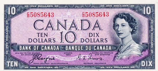 BANK OF CANADA. $10.00. 1954 Issue. BC-32a. 'Devil's Face'. Coyne-Towers. No. C/D5085643. PMG graded Choice Unc-64. EPQ.