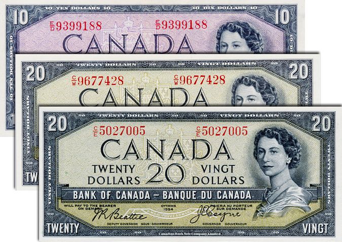 BANK OF CANADA. $10.00. 1954 Issue. BC-32b. No. E/D9399188 (changeover). BCS graded Extra Fine-40, (original). $20.00. 1954 Issue. BC-33b. No. C/E5027005. BCS graded Very Fine-35; $20.00. 1954 Issue. BC-41b. No. C/W9677428. BCS graded Choice Unc-64, (original). Lot of three (3) notes.