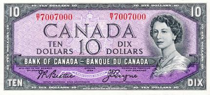 BANK OF CANADA. $10.00. 1954 Issue. BC-40a. Modified. No. B/T7007000. Unc. An interesting serial number.