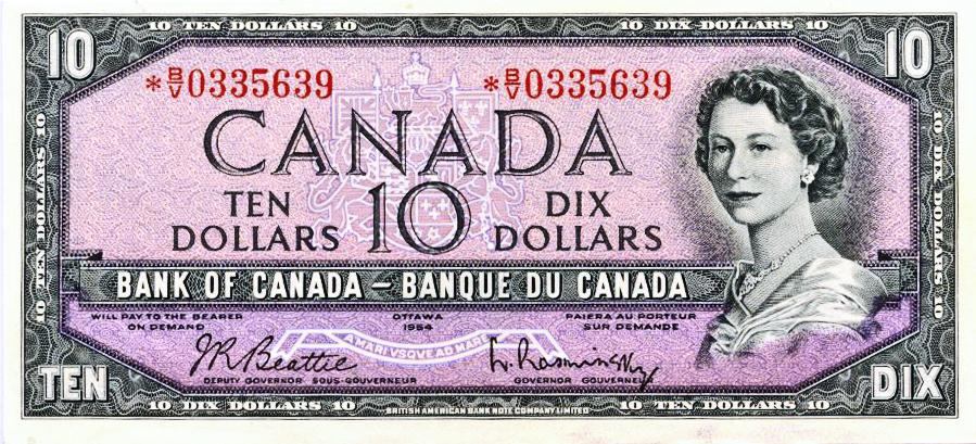 BANK OF CANADA. $10.00. 1954 Issue. BC-40bA. Modified. Beattie-Rasminsky. No. *A/D0027265. BCS graded AU-55. ‘Original’.