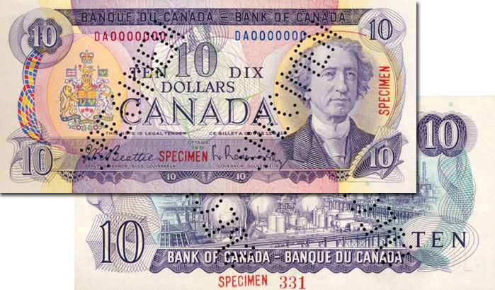 BANK OF CANADA. $10.00. 1971 Issue. BC-49a. Beattie-Rasminsky. No. DA0000000. A Specimen. Punch cancelled. Unc.