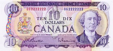 BANK OF CANADA. $10.00. 1971 Issue. BC-49a. Beattie-Rasminsky. No. DG2222222. CU.