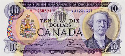 BANK OF CANADA. $10.00. 1971 Issue. BC-49c. Lawson-Bouey. No. VJ1234321. CU.
