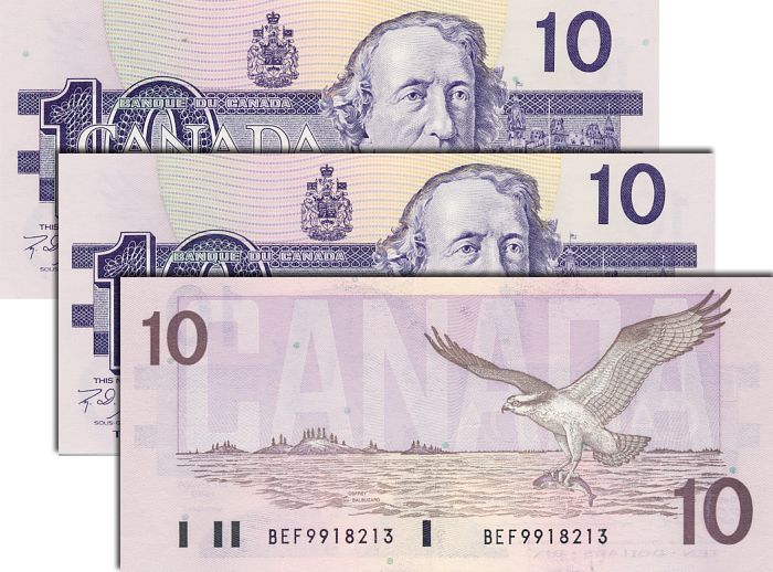 BANK OF CANADA. $10.00. 1989. BC-57c. No. BEF9918211, BEF9918212 and BEF9918213. One CCCS graded Gem Unc- 67, the other two CCCS graded Gem Unc-66.