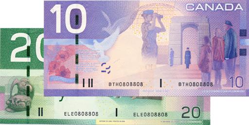 BANK OF CANADA. $10.00. 2005 Issue. BC-68b. No. BTH0808808; $20.00. 2004 Issue. BC-64a-i. No. ELE0808808. A matched serial number pair. Both Choice Unc.