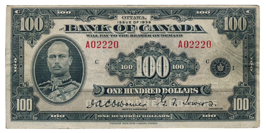 BANK OF CANADA. $100.00. 1935 Issue. English Text. BC-15. No. A02220/c. PMG graded Very Fine-25.